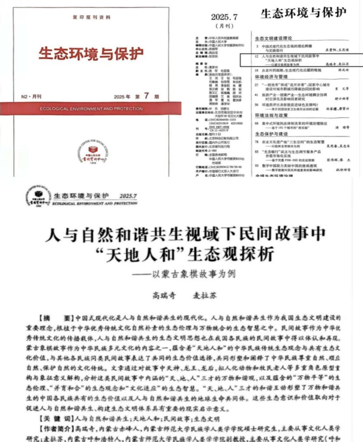硕士研究生高瑞奇同学撰写的论文《人与自然和谐共生视域下民间故事中“天地人和”生态观探析——以蒙古象棋故事为例》,被中国人民大学复印报刊资料《生态环境与保护》2025年第7期全文转载。