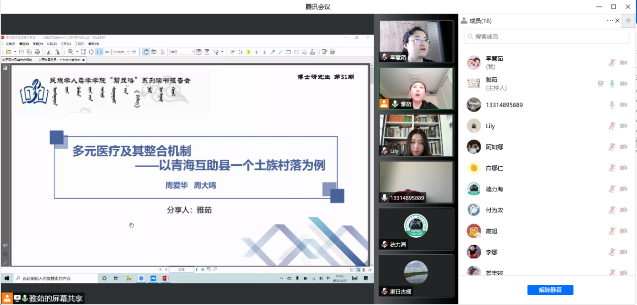 雅茹同学阅读分享的是《多元医疗及其整合机制——以青海互助县一个土族村落为例》(《民族研究》2021年01期)。分享者首先介绍了论文作者、以及选择该篇论文的缘由,其次着重介绍了该论文的写作思路和论文结构,对主要内容等进行了较为全面的介绍。最后指出,该文通过田野调查的研究方法,从村民、治疗者和社会距离等角度全面的阐述了土村多元医疗的方方面面。
