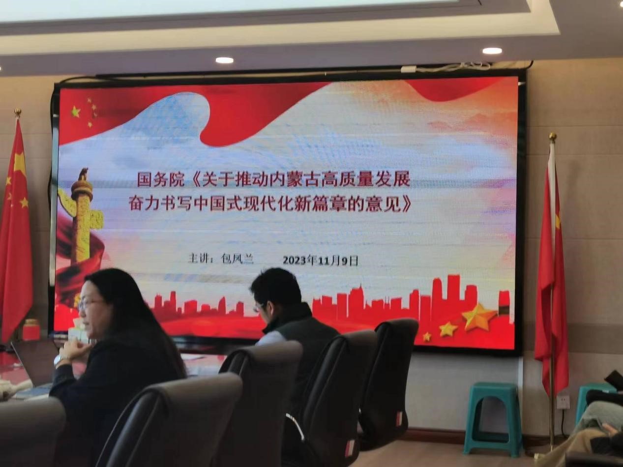教职工做题为“国务院《关于推动内蒙古高质量发展奋力书写中国式现代化新篇章的意见》”的专题党课。会议由党委委员、副院长满达主持。