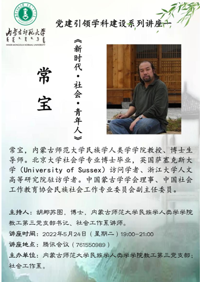 教授、博士生导师常宝主讲,教工第三党支部书记胡那苏图主持,学校内外150余人参与讲座。