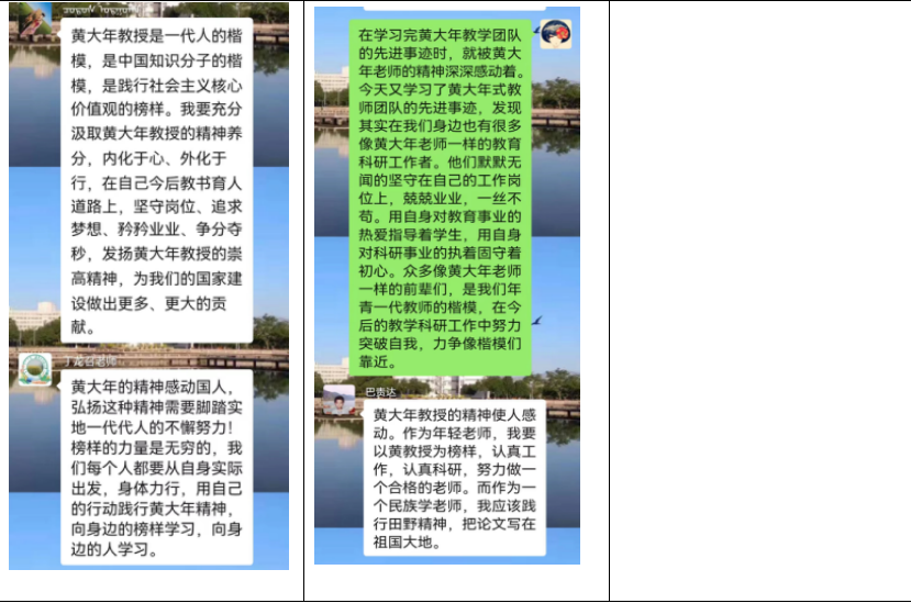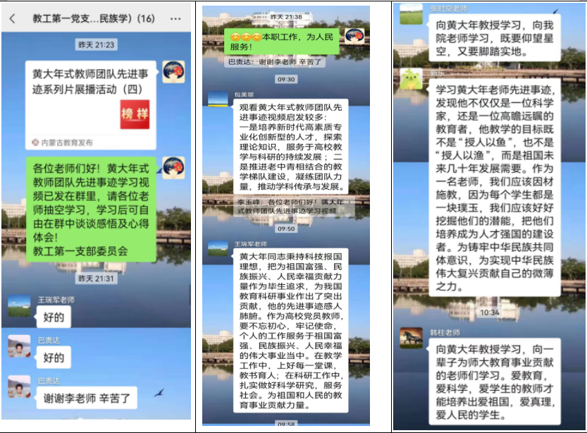 学习后,党员同志们感受颇多,在学习群中自由发表了自身的学习心得和感悟。多数教师党员认为模范就在身边,不用好高骛远,只要脚踏实地,兢兢业业,便是对黄大年老师及众多模范教育工作者精神的最大领悟。还有教师党员认为成果不是说出来的,而是一丝不苟的干出来的,多做实事才是硬道理。新入职的年轻党员教师同志们更是备受先进事迹的鼓舞,立志在岗位上,认真教学、认真科研,努力做一名合格的教师和一名合格的党员,把教学科研做在祖国的大地上